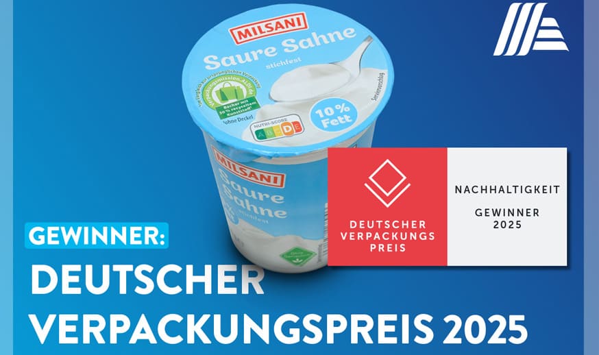 Der MILSANI Saure-Sahne-Becher von ALDI SÜD hat den Deutschen Verpackungspreis 2025 gewonnen. Eingereicht von der Unternehmensgruppe Theo Müller, dem Kunststoffproduzenten INEOS Styrolution und der Optipack GmbH, gewann der MILSANI Saure-Sahne-Becher in der Kategorie „Nachhaltigkeit: Rezyklateinsatz“. Der Becher, der seit Anfang des Jahres bei ALDI SÜD im Handel ist, hat einen Rezyklatanteil (gebrauchte Kunststoffe) von 30 Prozent und spart so jährlich bis zu zehn Tonnen Neukunststoff ein. Diese „CO2-reduzierende Anwendung“ sei ein „ehrwürdiger Fortschritt“, so die Jury des Deutschen Verpackungsinstituts (dvi) in ihrer Bewertung.